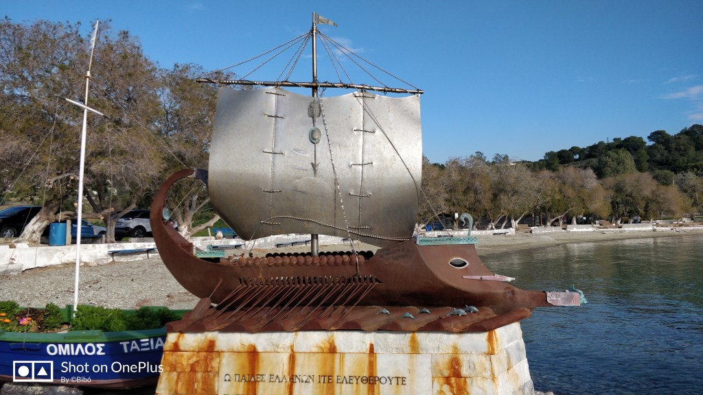 A második hajó kissé messzebb volt, pár percet autózni is kellett hozzá, de megérte, mert út közben láttunk egy táblát, miszerint éppen útba esik a Szalamiszi csata emlékműve is.